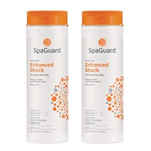 SpaGuard Enhanced Shock 2#. SpaGuard Enhanced Shock is a multipurpose shock with four functions in one: shocks, clarifies, flocculent and pH buffer. Restores water sparkle Removes unpleasant odors Treats and soak in as soon as 15 minutes Compatible with Chlorine or brominated spas and those using ozone or ionization systems.. 58.2% Sodium Dichloro-s-Triazinetrione