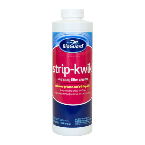 BioGuard Strip Kwik is an effective degreaser that unclogs your sand, cartridge and DE filter, restoring it to optimal efficiency. Its patented formula quickly cuts through the thickest oil, grease, dirt, and other contaminant buildup on your filter elements to greatly extend its lifespan, saving you money over the course of the pool season. Strip Kwik also is able to clean your filter in about an hour instead of overnight soaking like its competitors. Best of all, this product is made right here in the USA to ensure the highest quality, allowing you to buy with confidence.