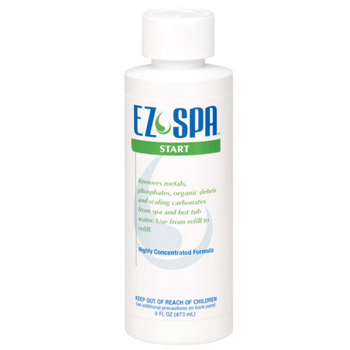 Use at start-up and each time the spa is filled, EZ SPA® START treats the source water by removing metals, phosphates, scaling carbonates and organic debris to keep the water clear and stain / scale free.
